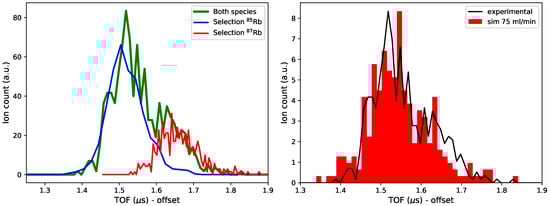 Furthermore, the simulated TOF distribution of a mixture of Rb and Rb with the correct elemental abundance was compared to the measurement using the same helium flow rate, and is presented in the right panel of Figure 6. The TOF offset was not measured experimentally with the oscilloscope and thus the simulation TOF was shifted by an arbitrary amount to match the centroid of the experimental spectrum. However, one notes that the experimental width and separation of the peaks is well described.