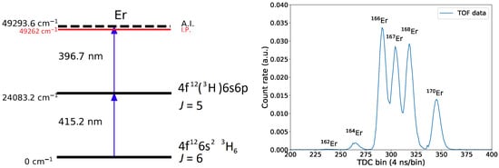 In these measurements, the NB Ti:sa system with a fundamental output linewidth 20 ≤ 50 MHz was used for the excitation step and a BB Z-type Ti:sa cavity was used for the ionization step. The ABU TOF resolution with stable erbium atoms was , with TOF = 21.4 s and = 40 ns. An acquired TOF spectrum resolving all stable Er isotopes following their natural abundances is shown in the right panel of Figure 7.