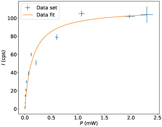 Measured count rate I as a function of excitation step power P for the RIS scheme presented in Figure 7. The orange curve represents a fit to the measured data.