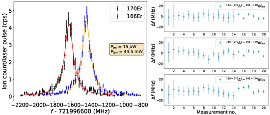 Fitting of the raw data was carried out by a procedure in SATLAS [35]. An IS result from a single scan of Er is presented in the left panel of Figure 9. The RIS measurements were performed with 10–20 W power levels for the excitation step and at 20–90 mW for the ionization step.