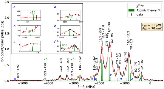 The HFS information was extracted from 11 scans, performed below the saturation power level. The g.s. and coefficients were fixed to the the literature values −120.487(1) and −4552.984(10) MHz [36], respectively. The nuclear magnetic octupole moment coefficients and for the g.s. and e.s. were set to 0. The fit result for a single scan is represented in Figure 10. The spectrum corresponding to all 21 HFS components has been recorded and fitted. In the presented fitting procedure, the peak intensities are left as free variables.