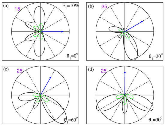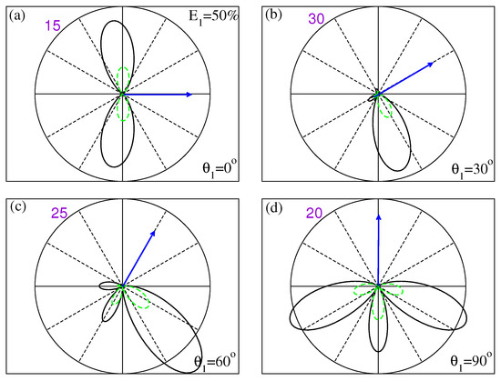 Triple-differential cross-section (TDCS) results from DPI of carbon at 10 eV excess energy ( eV) and equal energy sharing (). Each panel (a–d) shows the resulting angular distribution of the second electron when the first electron direction (blue arrow) is fixed at the angle shown relative to the polarization direction (horizontal). Present results for carbon (solid black line) are shown and compared with neon results (dashed green line) for the same initial-state coupling of the outgoing electrons and at similar excess energies as a percentage of the double ionization potential ( eV for neon). The purple numbers in each panel indicate the magnitude of the cross-section (in b/(eV sr) and establishes the radius of each circle. 1 b = cm.