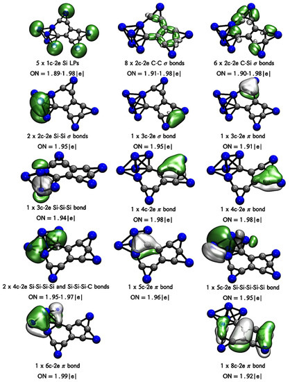 What about chemical bonding in these species? In general, we are interested in looking at the presence of both the 3c-2e bond of Si-ptC-Si and the π-aromatic circuit around the planar carbonaceous moiety. The NPA analysis predicts a negative partial charge distribution on the C and positive on the Si, agreeing with the differences in C/Si electronegativities. However, the most negative charges (about −0.9 ) are on the Si’s surrounding the ptC (see Figure S4). These results agree with the design model for these species, where protons are replaced by Si2+ dication.