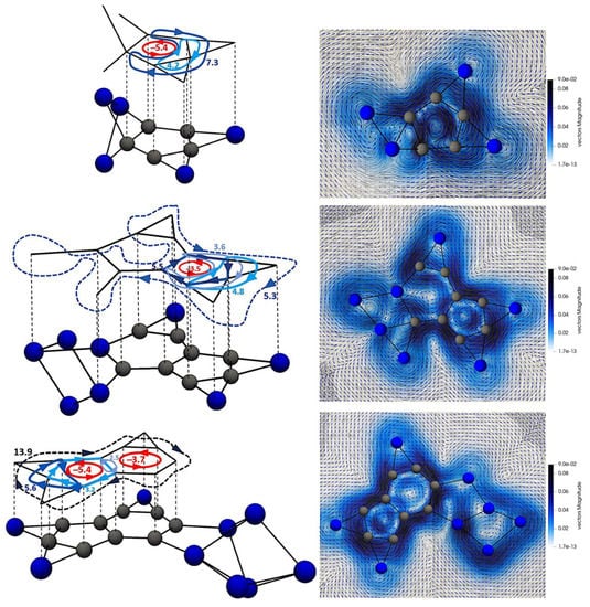 We will now analyze the magnetic response to an external magnetic field applied perpendicular to the Cn plane. This analysis aims to identify patterns related to the (anti) aromaticity phenomenon, i.e., the presence of (diatropic) paratropic ring currents, and to evaluate their intensity (ring current strength, RCS). For reference, the ring current circuits of benzene have been analyzed at the level used in this work. As can be seen from the results (Figure S5), benzene has a paratropic ring current of medium intensity (−3.5 nA.T−1) inside the C6 ring (from σ-electrons). In addition, there is an intense diatropic ring current (15.3 nA.T−1) around the C6 ring, giving an appreciable diatropic resultant of 11.8 nA.T−1, characterizing this aromatic molecule par excellence [40,55,56,57,58].