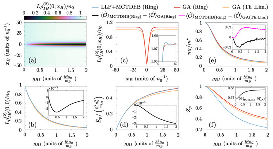 The equilibrium state properties of the polaron for weak intraspecies bath repulsions, , in the equal mass case, are compared in Figure 3 within the results of the MCTDHB and the GA approaches. In order to contrast the state of a system confined in a ring of to the thermodynamic limit , we also provide the corresponding results of the GA when extrapolated to the thermodynamic limit, see Refs. [55,56,57,58,59].