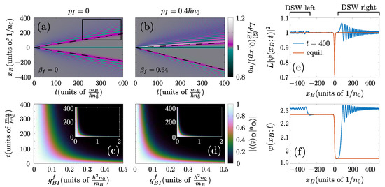 The finite asymptotic velocity of the impurity is indicated in as a difference in the magnitude of the relative velocity of the emitted dispersive shock waves. Indeed, by assuming that the disturbances travel with a velocity then in the impurity frame their velocities would be modified to , where is the velocity of the polaron. To estimate the final velocity of the polaron , we fit the density and phase profile of the GA wavefunction , after an evolution time of , to the corresponding analytic expression8, Equation (7), for obtaining and . In Figure 4b, we demonstrate that the above approximations are in excellent agreement with the motion of the dispersive shock waves. Notice here, that the emitted structures realize a so-called “light” cone via which the correlations among the bath and the impurity are spread in the system after the quench [144,145]. In particular, by examining the modulus (Figure 4e) and phase (Figure 4f) of , we can verify that the corresponding profiles match the equilibrium polaron solution with , Equation (7), in the spatial extent between the shock waves. Therefore, these excitations provide a means for transferring information regarding the generation of the Bose polaron throughout the BEC with a velocity equal to c, see also the dashed lines in Figure 4b.
