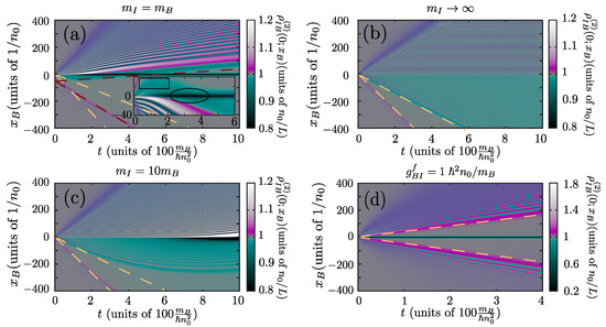 To relate the results of Equation (20) to the case of a polaron, we consider a massive impurity with . The justification of this choice is that a massive impurity possesses larger inertia and therefore it is less susceptible to deceleration stemming from the drag force exerted by the BEC. This allows us to probe a possible intermediate-mass regime for the cases depicted in Figure 6a,b. Figure 6c shows the time evolution of for a quench with the same parameters as in Figure 6a,b. For initial times, , the two-body correlations exhibit the same structure as the one observed in the Gross-Pitaevskii case. In particular notice the emission of the two downstream dispersive shock waves forming a “light” cone () and the quasi-stationary upstream oscillatory density pattern. Subsequently, due to the finite momentum of the impurity and the exerted drag force from the BEC, the impurity slows down. This can be verified by observing that for the position of the fronts of the emitted shock waves does not follow . Instead, they are shifted towards the impurity due to their reduced velocity. Turning to long times, , a sizable depletion of the BEC density in the vicinity of the impurity, (see Figure 6c), appears indicating the formation of the polaron.