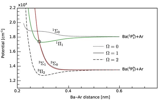 Instead of transferring the energy of the colliding system to the collision partners, a second scenario is to convert the excitation energy of the colliding atoms into translational energy. This can be understood using the barium–argon system as an example, as barium has a rather simple electronic structure compared with heavier elements [18,19,20,21]. The collisional de-excitation process can be understood by looking at the potential curves of the diatomic system, illustrated in Figure 1, formed by barium configured in different excitation states and argon in the ground state. If such curves have crossing points at given interatomic distances, marked with a circle in Figure 1, and if the symmetry of the crossing states allows the formation of an avoided crossing, then an inelastic collision can occur, transferring the population to the lower excited state and converting the energy difference into the translational energy of the system. For this specific example, barium atoms, excited to the state, for example, via laser excitation, are collisionally de-excited to the level through inelastic collisions with argon atoms. The crossing happens between the attractive potential curve and the repulsive potential curve, the latter adiabatically correlated with the barium level.