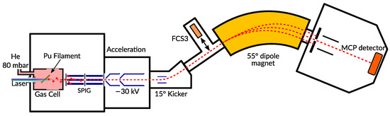 The resonant photo-ions were evacuated from the gas cell through an exit hole and guided towards the high-vacuum region of the mass separator using a radiofrequency sextupole ion guide (SPIG) [31]. The ions were accelerated to a potential of 30 kV, mass separated with a nominal mass resolving power of = 500, and detected in the focal plane of the separator using a multichannel plate (MCP) detector. A schematic overview of the experimental setup is shown in Figure 2.