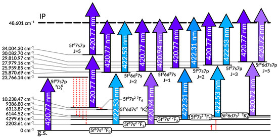 Initially, a three-step ionization scheme was tested, using laser radiation at wavelengths of 420.76, 847.26, and 750.24 nm, with the final step resulting in the population of an auto-ionizing (AI) state at 48,898 cm (Figure 3). This scheme was originally developed by Raeder and collaborators to selectively ionize plutonium isotopes under vacuum for trace analysis studies of environmental samples [33]. Surprisingly, in the gas-cell environment, the two IR steps did not contribute to the ion count rate. Nevertheless, a frequency scan of the first blue step wavelength presented a clear resonant signal and thus it was hypothesized that excitation and ionization proceeded via a Rydberg state located at around 47,532 cm, with ionization occurring via atomic collisions with He gas atoms. Only at a substantially reduced first step laser power was a small response to the ion count rate observed, with the addition of the two IR steps.