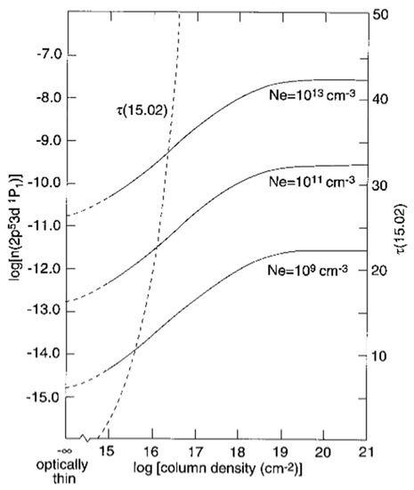 The level population increases by a factor of 1000 at a column length of 1021 cm−2 compared to the optically thin value. All the EUV lines originating from 3d levels are also affected by the opacity [40]. Eleven lines at 193.7, 226.1, 240.4, 295.98, 324.5, 340.1, 351.6, 358.24, 373.41, and 387.23 Å increase in intensity with respect to the 254.9 Å line with an increase in column length, reaching saturation value at a column length of 1021 cm−2. The magnetic dipole transition at 1153.2 Å is also enhanced by opacity.