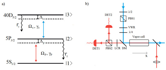 The excited electron in a Rydberg atom is very loosely bound to its ionic core, so Rydberg atoms exhibit exaggerated properties [4,5]. Among them, it is very high polarizability, which makes them very sensitive to electromagnetic fields and interactions with another Rydberg atom [6,7]. Such systems are perfect to be probed by EIT [8,9], and they are particularly attractive for quantum technologies [10,11,12,13,14]. EIT can also be used with Rydberg atoms to map interactions between those atoms to photon–photon interactions [15,16]. Another interesting application of the combination EIT–Rydberg atoms is the growing field of microwave and radio-frequency measurements [17,18,19,20,21,22]. All these Rydberg research areas require the ability to detect small changes in the EIT linewidth. Therefore, the development of experimental techniques which can produce narrower linewidths in Rydberg EIT is timely.