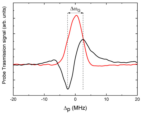 Probe laser transmission, with Gaussian mode control beam. The red line is the signal obtained with a single photodiode, which shows the EIT Lorentzian transmission profile. The black line was obtained with the PS technique. The transition is set to = 0 MHz. For both curves, MHz and = 0 MHz. The frequency difference between the valley and the peak of the PS signal is for the Gaussian mode.