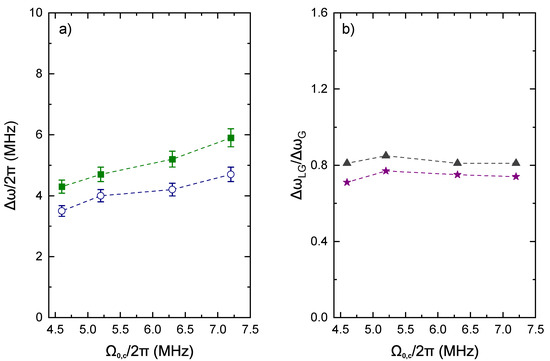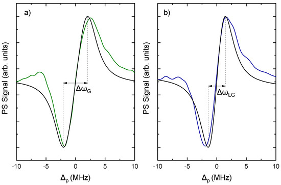 Figure 3 shows the experimental PS spectra (colored lines) as a function of for a Gaussian (Figure 3a—green line) and (Figure 3b—blue line) mode control beams. The black lines are the theoretical model, considering MHz, and . In this case, we have measured MHz and MHz for the Gaussian and mode, respectively.