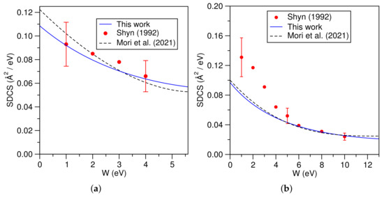 - Shyn, T.W. Doubly differential cross sections of secondary electrons ejected from atomic hydrogen by electron impact. Phys. Rev. A 1992, 45, 2951–2956. [Google Scholar] [CrossRef]