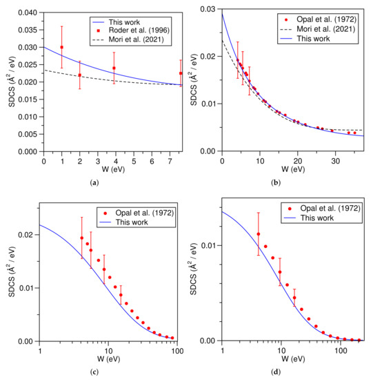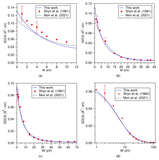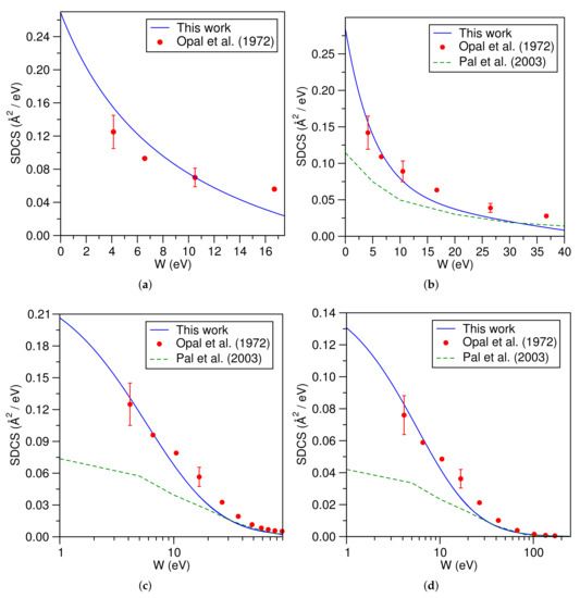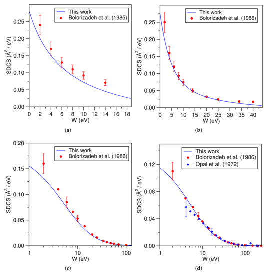 The BEB-SDCS for HO at various incident energies are shown in Figure 6a–d. The electron-impact SDCS are of use in determination of the rotational abundance of water in cometary atmospheres and the modeling of combustion products from fossil fuels [42]. Since it is present in living tissues, the ionization cross sections for water can be used to obtain a rough estimate of the energy deposition and damage caused by the ionizing radiation in biological matter [43,44]. A good agreement is observed between experimental results of Bolorizadeh et al. [45], Opal et al. [35], and the present results. These results improved as the energy of the primary electron increased.