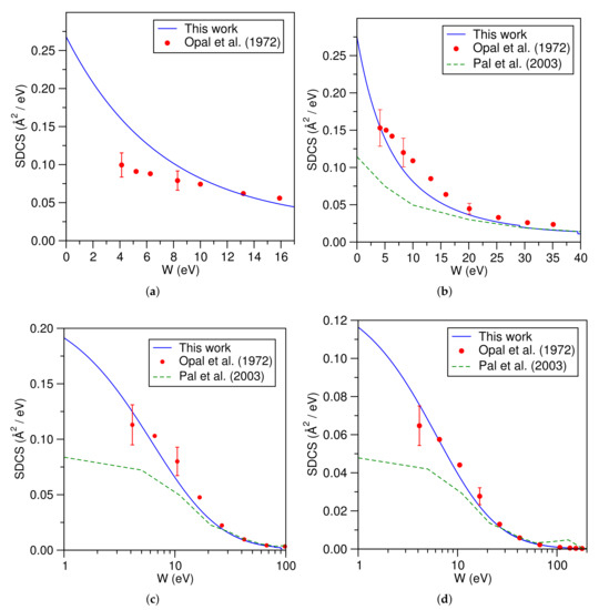 Ionization cross sections for N are relevant in modeling atmospheric plasmas and the interactions of high energy charged particles with the atmosphere (for example, the northern lights) [37,38]. The BEB-SDCS for various impact energies are shown in Figure 4a–d along with the experimental as well as the theoretical data. The experimental cross sections are from Opal et al. [35] and the theoretical results are from Pal et al. [39]. Pal and coworkers used a Jain-Khare semiempirical approach for the calculation of SDCS in their work. The SDCS given by the BEB model were in better agreement with the experimental values than Pal et al. [39].
