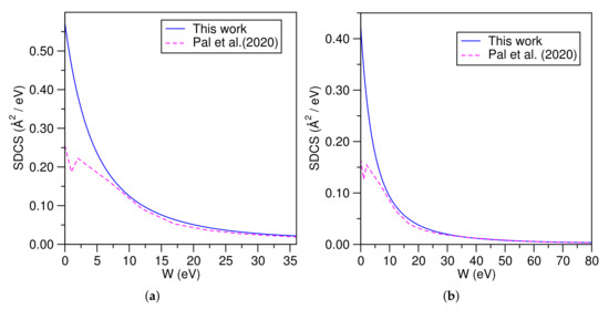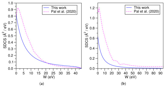Acetylene plasmas find use in various fields such as the production of fullerenes [46] and in nanoscience for the production of carbon nanoparticles [47]. Several kinds of simple hydrocarbons, including acetylene are present in interstellar clouds [48]. The fact that simple hydrocarbons form as a result of astrophysical processes has important implications for astrobiology [49]. The availability of accurate electron-impact cross sections of these simple hydrocarbons aids the study of the chemical evolution of the matter present in interstellar meda. Electron-impact ionization data for acetylene are also important in simulations of fusion plasmas for reactors, which use graphite as the wall material [50]. The BEB-SDCS for CH at incident energies are shown in Figure 7a,b. We have also included the recent theoretical work of Pal et al. [51].