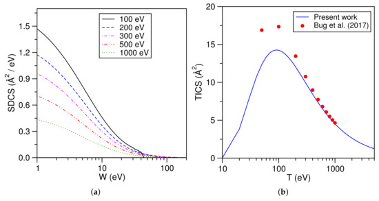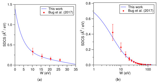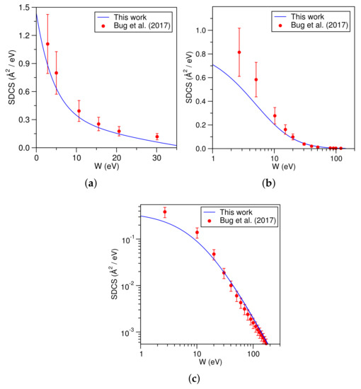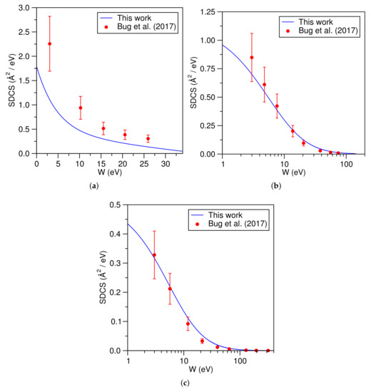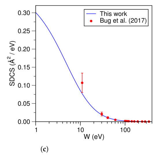 Trimethyl ester of phosphoric acid (TMP) is a structural analogue of the phosphate group of DNA, which is one-half of the sugar–phosphate backbone of the DNA double helix structure. The electron-impact ionization SDCS for TMP are shown in Figure 12a–c. Values derived by Bug et al. from the experimental data with an error in the order of 25% [59] are also shown.