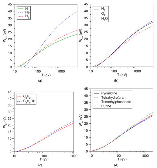Average secondary electron energies, , calculated via Equation (4) for the targets discussed throughout this work are shown in Figure 14a–d. It seems that there is some dependence of on the geometrical size of the targets. Furthermore, it appears that at around 100 eV energy of the primary electron, the average energy of the secondary electron in almost all cases was around 10 eV with the exception of He. This artifact is due to the fact that the graphs are plotted on a large scale along the x-axis. In fact, the W as a function of incident energy, depends upon several factors such as the threshold energy, ionization cross sections, and SDCS. The inputs to calculate SDCS or TICS were B, U, N, and the experimental value of the ionization threshold. All the targets showed rising trends in W with an increase in incident energy from their respective thresholds. The SDCS were continuously decreasing with the increase in primary electron energy or secondary electron energy, whereas the TICS showed rising trends from the threshold until a maximum was reached; then, they start falling with further a increase in incident energy of the primary electron.