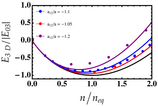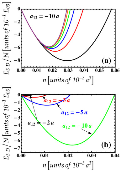 A similar stabilization scenario has been observed in single and binary dipolar Bose gases, where the competition between the mean-field energy associated with short and long-range interactions and the LHY corrections arrests the dipolar instability at high density, forming ultradilute quantum droplets [26,27,28,29,30]. Furthermore, quantum fluctuations play an intriguing role in low-dimensional dipolar BECs. They change their nature from repulsive to attractive due to the peculiar momentum dependence of the dipole–dipole interactions [8,31,32]. The dipolar instability is halted by such unconventional beyond mean-field corrections, leading to the formation of a droplet phase. The LHY quantum corrections lead also to shift the equation of state of disordered BECs [33,34].