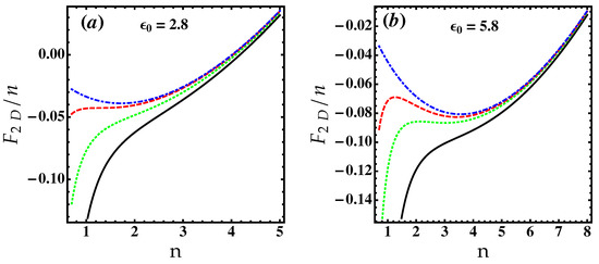 (Color online) (a) Two-dimensional free energy as a function of the density for different values of temperature, and for . Black lines: . Green dotted lines: . Red dashed lines: . Blue-dot-dashed lines: . (b) The same as (a) but for . Black lines: . Green dotted lines: . Red dashed lines: . Blue-dot-dashed lines: . Parameters are: , and .