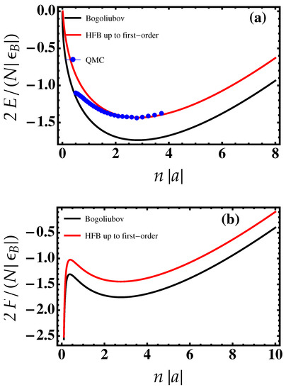 In Figure 6a, we show the ground-state energy predicted by the HFB theory up to first-order in and for (i.e., ) and compare it with the Bogoliubov prescription [21] and QMC simulation [38]. We find an excellent agreement between our HFB theory and the QMC data [38]. However, the discrepancy between the HFB results and the Bogoliubov theory of ref. [21] can be attributed to the quantum fluctuation corrections. In the regime of strong interactions, one can expect that the Bogoliubov theory significantly deviates from the QMC data, since it is valid only in the dilute regime.