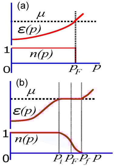 To gain more insights into the physical properties of the FC state, it is helpful to explore the system behavior at . It was shown earlier [1,15,19] that the ground state of a system with FC is highly degenerate. In this case, the occupation numbers of the FC state quasiparticles (i.e., having dispersionless spectrum or belonging to the flat band) change gradually from to at . This variation occurs at . It is clear that such a property of the occupation numbers drastically differs from the property of the usual Fermi–Dirac function property at . Indeed, in that case, the Fermi–Dirac function is represented by the step function between and at , where stands for Fermi momentum, see Figure 1.