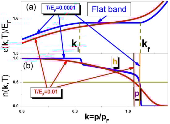 Thus, the infinite degeneracy of the FC ground state generated by flat bands, see Refs. [19,20] for a comprehensive discussion. We note that for systems where the Nernst theorem is violated due to the ground state degeneracy is a spin glass [40,41]. It is well known that in normal Fermi liquid the function at finite temperatures loses its step-like feature at , becoming continuous around this point. The same is valid for a Fermi liquid with flat bands; this conclusion follows from Equation (4). This means that at small but finite temperatures the degeneracy of the above ground state is lifted, consequently the single-particle energy acquires a small dispersion [4]
