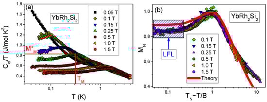 Here, and are constants. Under the application of a magnetic field, the system transits to the LFL state with the effective mass becoming almost temperature independent and strongly dependent on B, as seen from Equation (11).