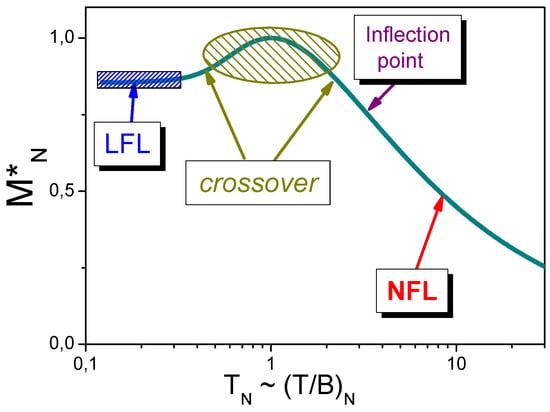Scaling of the thermodynamic properties governed by the normalized effective mass in the case of the application of a magnetic field , as follows from Equation (13). The solid curve depicts versus normalized temperature . It is clearly seen that at finite , the normal Fermi liquid properties take place. At , enters the crossover state, and at growing temperatures it exhibits the NFL behavior.