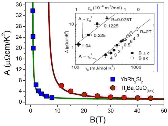 where and D are fitting parameters. Figure 5 displays experimental data for collected on two HF metals: [48] and [49]. The solid curves represent our calculations, and the inset demonstrates that the well-known Kadowaki–Woods ratio [50] is conserved [48]. This experimental result is in good agreement with Equations (15) and (16).