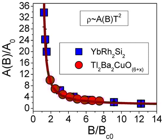 where is a constant. From Equation (17), it is seen that upon applying the scaling to both coefficients for and for , they are reduced to a function depending on the single variable , thus demonstrating the universal behavior. To support Equation (17), we plot both dependencies in the reduced variables and in Figure 6; the universal scaling nature of the coefficients of these two substances is immediately revealed. We note that the negative magnetoresistance of both and results from diminishing under the application of a magnetic field as follows from Equation (11).