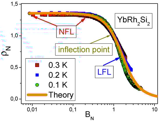 The scaling behavior of the longitudinal magnetoresistance (LMR) collected on [48] confirms our above conclusions. This scaling behavior is displayed in Figure 7. Clearly, our calculations are in good agreement with the experimental data. Thus, the fermion condensation theory explains both the negative magnetoresistance and the crossover from the NFL behavior to the LFL one under the application of magnetic fields.
