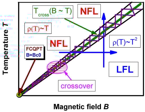 Based on Equation (12) and Figure 3 and Figure 4, we can construct the schematic phase diagram of HF metals [52], reported in Figure 8. We assume here that at and the system is approximately located at the FCQPT. In the case of , the system is located at the FCQPT without tuning. At fixed temperatures, the system is driven by the magnetic field B along the horizontal arrow (from the NFL to the LFL parts of the phase diagram). In turn, at fixed B and increasing T, the system moves from the LFL to the NFL regime along the vertical arrow. The hatched area indicating the crossover between the LFL and the NFL phases separates the NFL state from the slightly polarized paramagnetic LFL state. The crossover temperature is given by Equation (13).