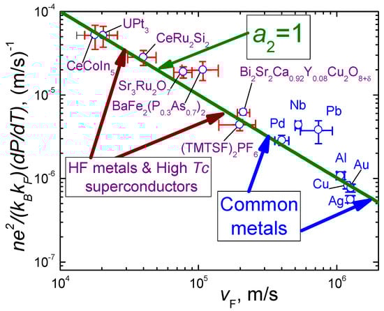 (1) Experimental data corroborate Equation (20) in the case of both strongly correlated metals and ordinary ones, provided that these demonstrate the linear T-dependence of their resistivity [21], see Figure 9;