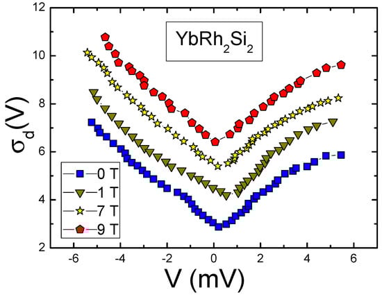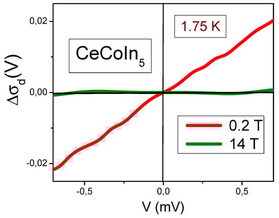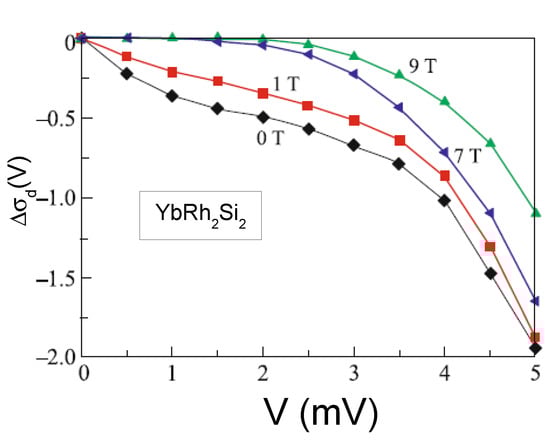 - Pristàš, G.; Reiffers, M.; Bauer, E.; Jansen, A.G.M.; Maude, A.D.K. Suppression of asymmetric differential resistance in the non-Fermi-liquid system YbCu5−xAlx ((x = 1.3 − 1.75) in high magnetic fields. Phys. Rev. B 2008, 78, 235108. [Google Scholar] [CrossRef]