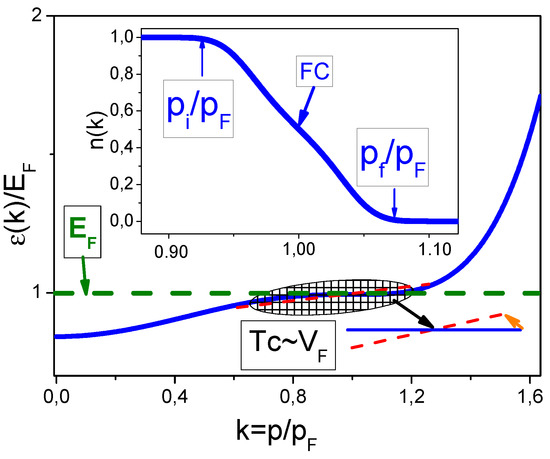 Flat band versus superconducting (SC) state. At , the flat single particle spectrum with is depicted by the solid curve. The transformed flat band by SC with finite is displayed by the red dashed line, see Equation (40). This change is shown by the arrow and by the blue solid and red dashed lines. The dashed area shows the flat band deformation by the SC state. Inset: the occupation numbers at as a function of the dimensionless momentum . FC location is displayed by the arrow, with labels and revealing the area where , see Equation (7).