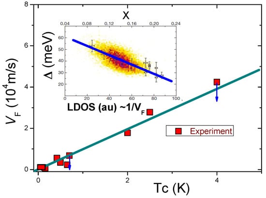 Measurements of as a function of [16] are depicted in Figure 17. The inset in Figure 17 shows experimental data collected on the high- superconductor in measurements using scanning tunneling microscopy and spectroscopy; here, is oxygen doping concentration [92]. The integrated local density of states is shown in arbitrary units (au). The straight line depicts the local density of states that is inversely proportional to . Note that the tunneling current is proportional to the integrated local density of states [92]. From the inset, it is clear that the data taken at the position with the highest integrated local density of states has the smallest gap value [92]. These observations are in good agreement with Equations (39) and (40). Thus, our theoretical prediction [15,17] agrees very well with the experimental results [16,92,93]. We note that as , as seen from Figure 17. This result shows that the flat band is disturbed by the finite value of , and possesses a finite slope that makes , as seen from Figure 16. Indeed, from Figure 17, the experimental critical temperatures do not correspond to the minima of the Fermi velocity as they would in any theory wherein pairing is mediated by phonons (bosons) that are insensitive to as they would in any theory wherein pairing is mediated by phonons, or any other bosons, that are insensitive to [16].