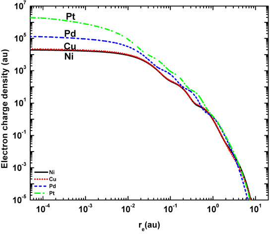 Electron charge density () for Ni (—, black), Cu, red), Pd (−-−-, blue), and Pt, green) as a function of the distance from the nucleus.