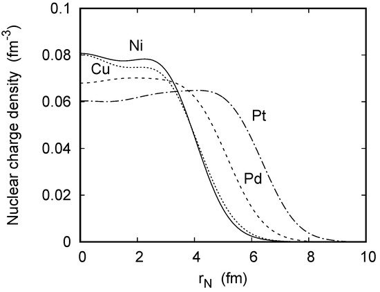 Figure 3 displays the respective nuclear charge densities. Clearly, the heavier the target nucleus, the larger their extensions. In contrast to the densities resulting from nuclear structure calculations (see, e.g., [13,31]), the shell structure at small distances is washed out due to the fit of the Fourier–Bessel expansions to experimental elastic electron scattering data, which is used here. Nevertheless, the pronounced minimum for Ni relates to a magic number of protons (), whereas Cu has an additional loosely bound proton which widens the charge distribution [32]. Pd and Pt are elements with open-shell nuclei, showing only very shallow minima.