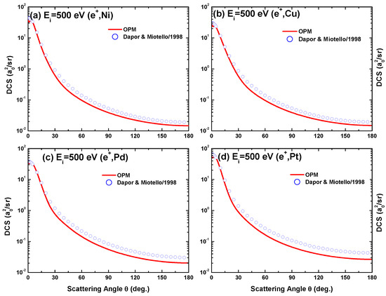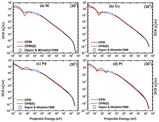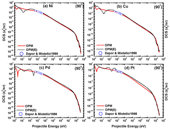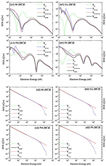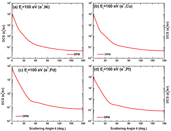 Figure 6, Figure 7 and Figure 8 display our OPM results of the DCS for electron scattering from the studied four metal targets at impact energies = 40, 100, 500 and 10,000 eV. It is evident that Ramsauer–Townsend structures [33,34] appear in the DCS, caused by the interference effects of the projectile electrons scattering from the individual electrons of the atom. As expected, the interference structures disappear at higher energies (well above 1 keV), when the collision becomes so energetic that the projectile–atom interaction occurs inside the K-shell.
