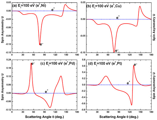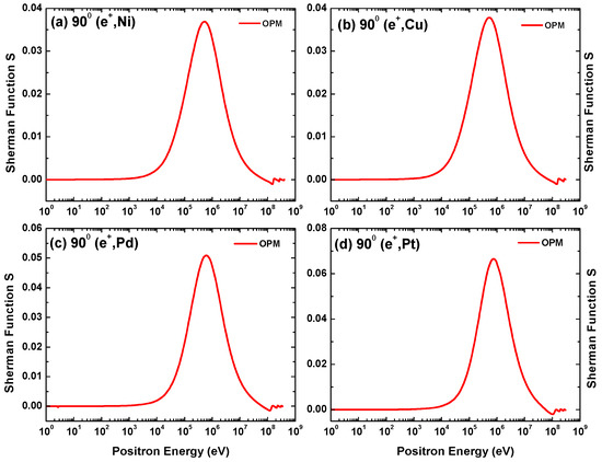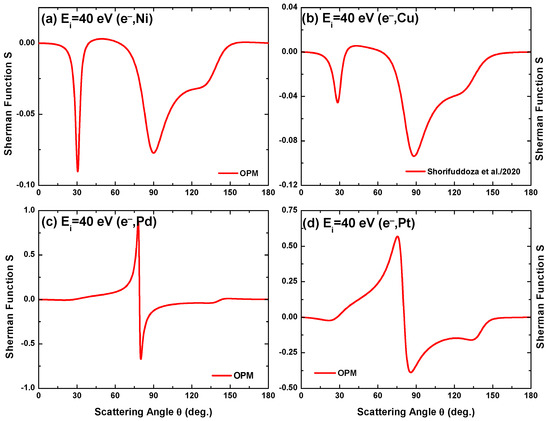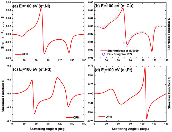 Our OPM results of the Sherman function for electron scattering from Ni, Cu, Pd, and Pt at impact energies = 40 eV, 100 eV, 500 eV, 1 keV, 10 keV, and 100 keV are displayed in Figure 10, Figure 11, Figure 12 and Figure 13. Included are calculations by Fink and Ingram [39] for the Cu target at 100, 500, and 1000 eV for comparison with our findings. As seen in Figure 11b, apart from minor differences near the extrema our OPM results agree well with the relativistic calculation of [39]. The same is true for the two higher energies [6]. It is worth mentioning that although the present OPM and the work of [39] are based on Dirac’s relativistic dynamics, the latter did not include the exchange, polarization, and absorption potentials in their calculation. Furthermore, they used the Hartree–Fock–Slater (HFS) atomic potential in their calculation. As such, the differences between these two calculations can reveal the sensitiveness of the Sherman function, primarily by the potential adaptation.
