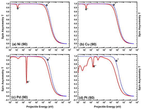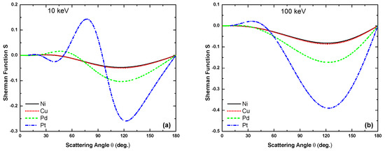 It is evident from Figure 10, Figure 11, Figure 12 and Figure 13 that, as expected, the minima in relate to the minima in the DCS. However, the structures in are much more pronounced because of the greater sensitivity of to the variation of the potential, leading to a variation of the phases of the scattered waves, as compared to the DCS. It can be seen that between 500 eV and 10 keV the number of minima becomes larger when proceeding to heavier metal atoms. Moreover, for eV, the magnitude of the Sherman function increases strongly with the size of the target atoms. For example, at 500 eV the maxima of vary from 0.05 for Ni to 0.88 for Pt.