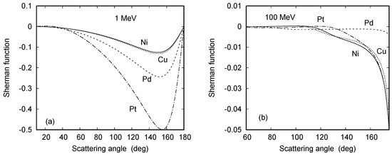 When considering the Sherman function at yet higher energies of 1 MeV and 100 MeV (Figure 14), the following additional systematics are noted. At keV the dominant structures are sharp, corresponding to deep minima in the DCS, while the extrema in S become increasingly broader at keV, and the relation to the cross section minima gradually disappears. In addition, the pronounced maximum in the forward hemisphere completely disappears near 1 MeV; at 100 MeV, the minimum shifts from (at 10 keV) to near , beyond which S increases sharply to zero at . At this ultrahigh energy, the structures reappear in concord with the oscillatory behavior of the DCS.