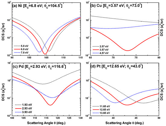 A notable feature is the dependence of the interference structures on the target species and their shell structure as regards the number and location of the DCS minima in the angular distribution. For the alkali atoms studied in [13], this number increases with the number of target shells for all energies between 40 eV and 500 eV; the metal atoms, however, do not show this feature for eV. At 40 and 100 eV (Figure 6 and Figure 7) three minima are found irrespective of the target, except for Pt at 100 eV, for which there are only two minima. At the lowest energy (40 eV), their locations exhibit target independence. At 500 eV, on the other hand (Figure 8a), the number of minima is one, one, two, and three (plus a shallow one) for the Ni, Cu, Pd and Pt targets, respectively. The onset of the first oscillation decreases with , as evident from the appearance of the first minimum at , and for Ni, Cu, Pd, and Pt, respectively. At yet higher energies, the structures gradually fade out (Figure 8b).