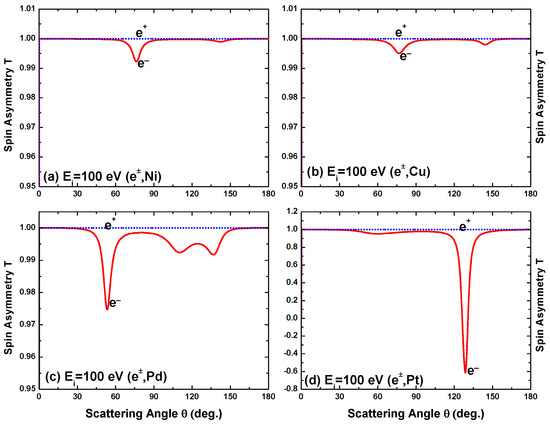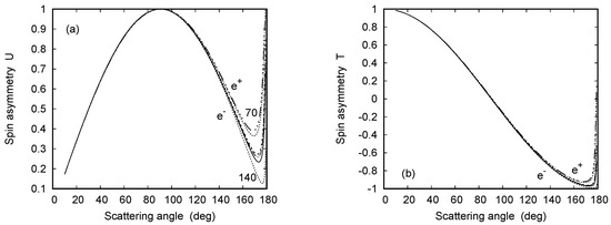 For the spin asymmetries , and T, large electron–positron differences are found at the lower collision energies. For electron impacts, their diffraction structure corresponds to that in the DCS and leads to a large polarization, with the number of total polarization points of S increasing with the number of shells. For positrons, on the other hand, the spin asymmetries remain close to their asymptotic values of zero (S and U) or one (T), again pointing to ineffective positron–electron cloud scattering.