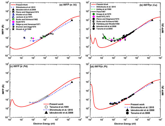 Inelastic mean free path (IMFP) in for positrons colliding with (a) Ni, (b) Cu, (c) Pd, and (d) Pt as function of collision energy, . Shown are the present results (—, red) and the theoretical results from Ashley (—, upper line in (b), black [74]) and Ghosh and Aers (, blue [76]).