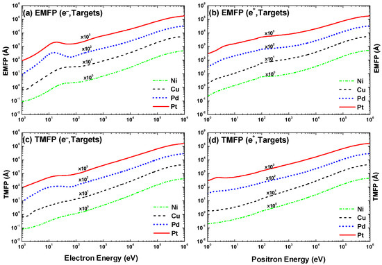(a,b) Elastic mean free path (EMFP) and (c,d) total mean free path (TMFP) in for (a,c) electrons and (b,d) positrons colliding with Ni (, green), Cu (, black), Pd (, blue), and Pt (—, red) as function of collision energy .