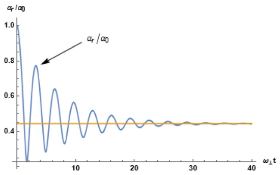Taking typical MOT parameters [1,3,21,33,34,35,40], Equations (19) and (20) can be numerically solved. These parameters are: , (rubidium), , and , for , where , , , , and . The resulting damped nonlinear oscillations are shown in Figure 1. The equilibrium values are found from the conditions